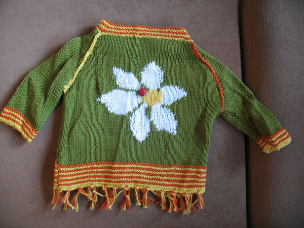 So den grünen Baumwollpulli mit der Blume: