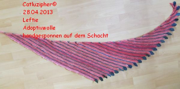 ist fertig, denn ich habe zwei wunderbare Kammzüge nebst Muster zum Verstricken geschenkt bekommen. Ein Leftie ist es geworden und er fgefällt mir sehr gut – so rosaROT wie er ist 😀
