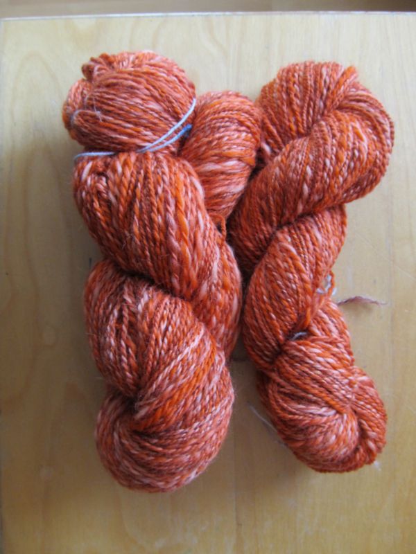 Die Spinnerei ging diese Woche auch voran, so dass wieder zwei Stränge der Merino Multicolor fertig sind – das ist meine Arbeitsspinnerei. Die Wolle ist zwar ssehr schön, aber nach 200 g wird es trotzdem etwas langweilig. So spendiere ich mir nach jeder Spule orange einen bunten Kammzug 😀 zur Erholung.