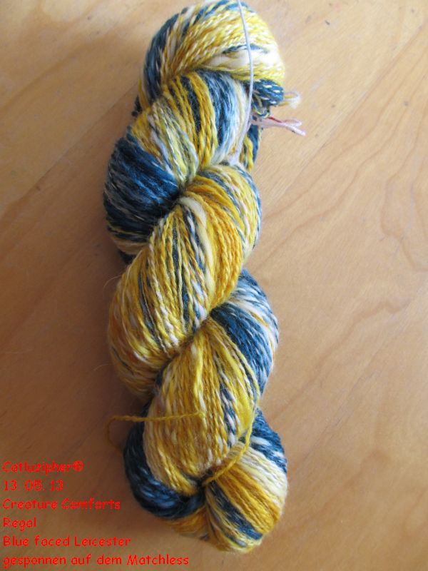 und auch das Spinnrad war fleißig und ich habe mal wieder einen Kammzug zum Genießen gespinnen – Blue Faced Leicester in der Farbe Regal