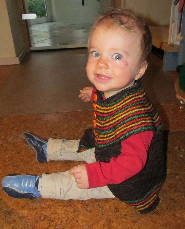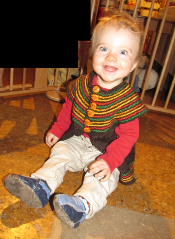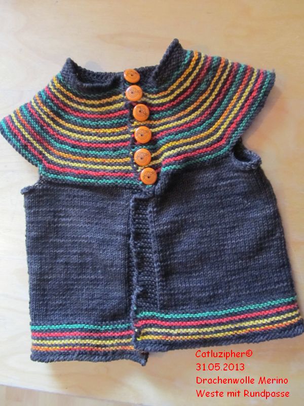 So habe ich für Tim eine Weste entworfen. Ich hatte einige schöne Reste von der Drachenwolle Merino, die ich sehr mag. Daraus sollte was für den kleinen Mann werden. Etwas mit einer Rundpasse – denn die mag ich im Moment sehr, ärmellos und bunt. Nachdem ich mich zuerst bei der Rechnerei der Rundpasse von oben vergallopiert habe…die Sache mit dem Zinseszins oder so – habe ich nochmal von unten begonnen und das gute Stück war wunderbar schnell gestrickt.