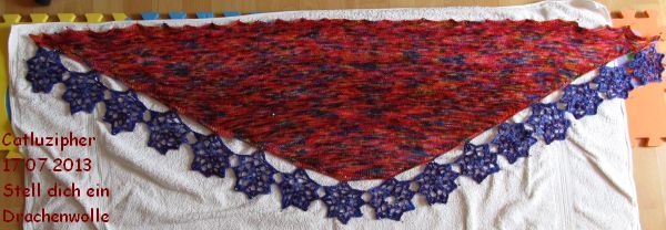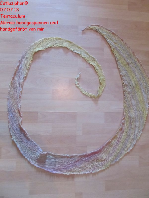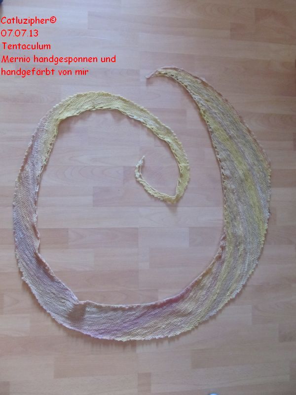 Ich habe endlich ein Lacegarn verstrickt, das ich vor einiger Zeit selbst gefärbt und selbst versponnen habe. Ein Tentaculum ist daraus geworden.