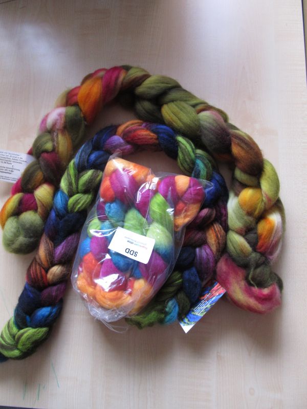 Letztes Wochenende habe ich ja den werten Gatten vom Flughafen abgeholt und danach sind wir gleich aufs Sommerfest von handgefaerbt.com und Etherische Öle und mehr gefahren, das nur 20 Minuten vom Flughafen entfernt stattfand. Schön wars 🙂 und ein bisschen Wolle hat mich auch nach Hause begleitet – vor allem fürs Spinnrad: