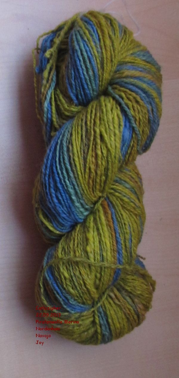 Auf dem Spinnrad hatte ich die letzten Wochen als Belohnungskammzug meinen Erinnerungskammzug vom Stricktreffen in Nordenham. Gesponnen habe ich diesen auf dem Joy und danach navajogezwirnt auf dem Matchless. Danach musste ich die Spulen des Matchless endlich mal abhaspeln um darauf den Rest der Multicolor in Orange spinnen zu können. Daher sind die beiden Stränge von der letzten Runde nun auch endlich fertig abgehaspelt.
