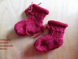 Dann wurde ein Paar Booties fertig aus einem gut abgelagerten Rest von Drachenwolle