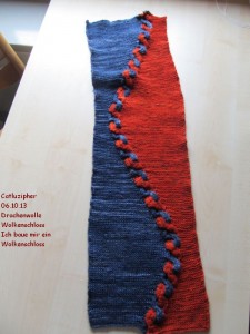 Ich baue mir ein Wolkenschloss aus rot und blau – ein wunderbares Garn das Wolkenschloss aus dem Drachenhort und ich kam in den Genuss einen roten und blauen Strang verstricken zu dürfen. Meine Idee war ein Schal – einfach kraus gestrickt, dann kam ein Zopf in der Mitte hinzu – zweifarbig natürlich und damit das ganze nicht ganz so streng wirkt, ließ ich diesen Zopf dann wellenartig hin und her wandern.