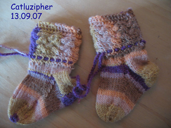 habe ich mir gleich zwei Reste geschnappt und losgelegt.Das Ergebnis ist ein Paar Socken für unseren Krümel und es wie immer riesig Spaß gemacht – wobei ich regelmäßig beim Anschlagen und bei den letzten Fersenreihen mächtig am …. war.