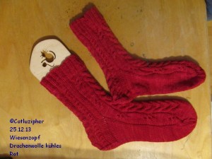 Also die Socken als erstes. Da sind es zwei Paar – einmal Dätschmernet – Socken für meine Schwester . die sie zu Weihnachten verschenken wollte. Farbe rot Muster egal. Also habe ich ihr einen Strang Drachenwolle kühles Rot gegönnt und diesen mit dem Wiesenzopf geschmückt.