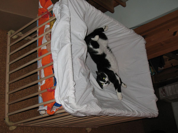 Wir kennen doch unseren Kater und deshalb wird das Babygefängnis nachts katersicher gemacht. Man hört seinen Einstieg jeden Abend am Klappern der Rasselkette *grins*
