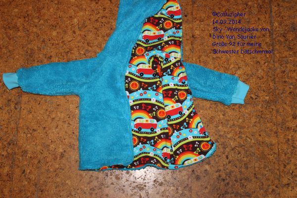 Dann sollte ich für meine Schwester eine Jacke nähen. Vom Drachen hatte ich noch türkisen Plüsch über. Diesen kombinierte meine Schwester dann mit einem bunten Bullistoff.