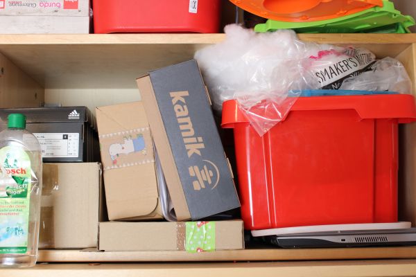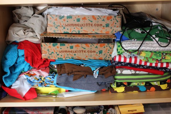 In dem Regal über dem Schrank stehen meine Projektkisten, die, wenn ich nähe irgendwo stehen und in die ich immer alles hineinverräume, wennich eine Pause machen muss – wiederum dem unermüdlichen Entdeckerdrang meiner Brut zu verdanken.