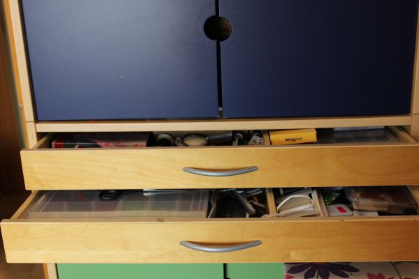 In den Schubladen ist all das drin, was ich so brauche – Knopfkisten, Scheren, Pfeiltrenner, Zangen für die Knöpfe, Fadenalbum , Maßband, Rollschneider und und und.