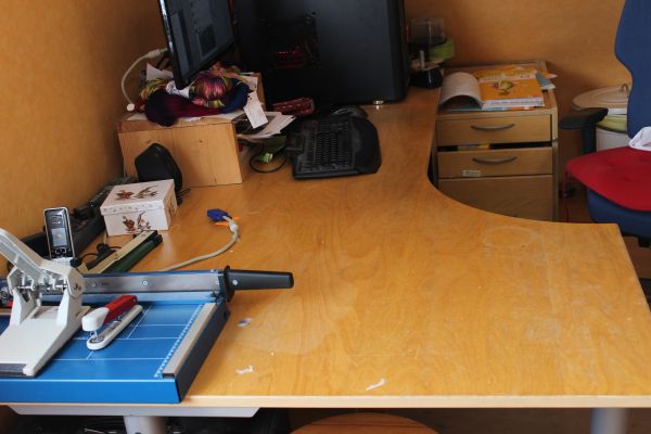 Mein Arbeitstisch ist im Moment im Schulmodus ( und weitgehend leer, denn ich bin soweit fertig mit der Vorbereitung für die nächsten Tage – das sah heute schon anders aus. )