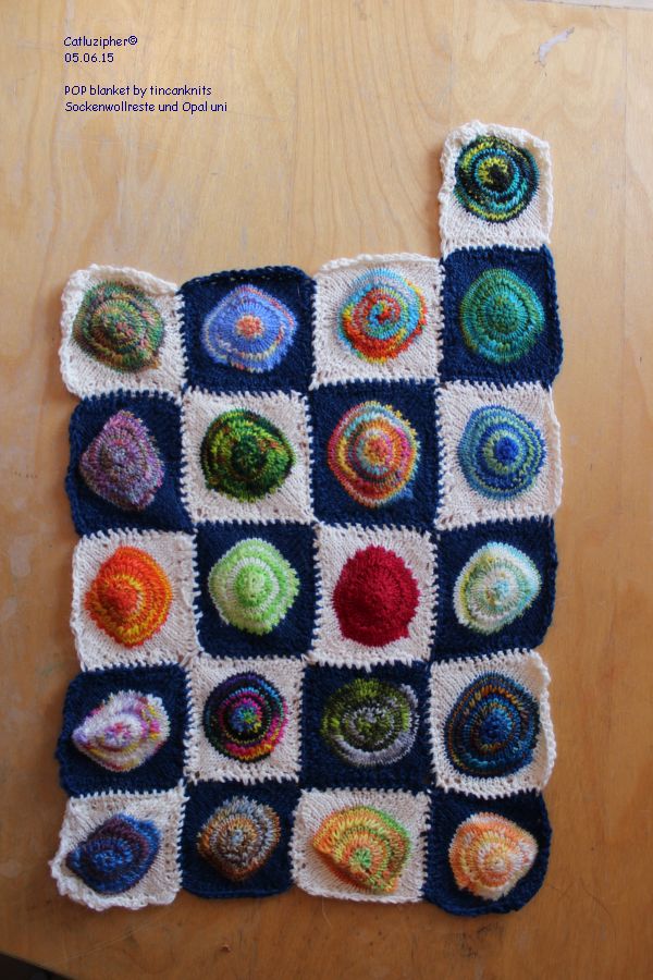 Ganz neu im Reigen ist die POP – Blanket aus Sockenwollresten. So sieht sie im Moment aus.