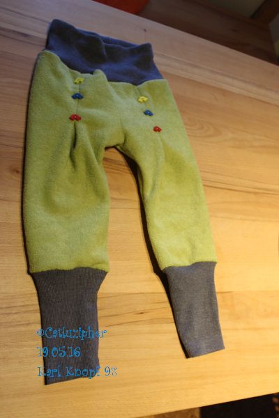 Für den Räuber habe ich die Karl Knopf gemacht. Er trägt sie gerne und liebt die Knöpfe daran sehr. Da es ein Versuch war, habe ich einen vorhandenen Stoffrest verwendet.