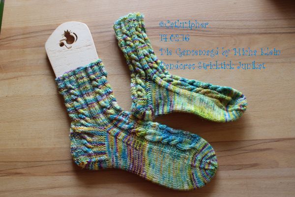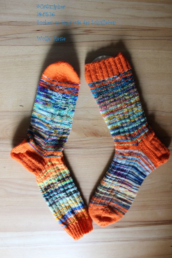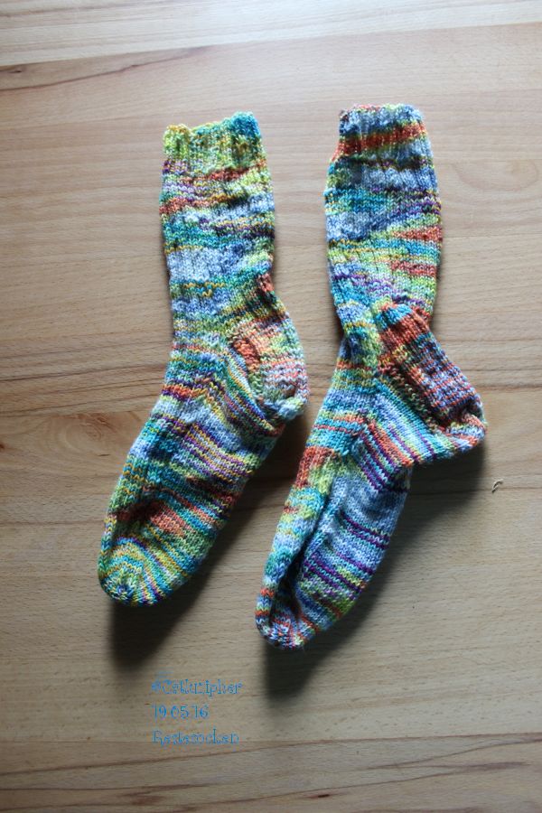Anfang des Jahres kam die Anfrage, ob ich etwas zum Abschied für einen ehemaligen Schulleiter betragen wolle und klar will ich das. Ein Paar Socken so bunt wie das Schulleben entstand.