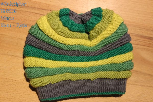 Für den Großen haben wir im Schlussverkauf eine jacke für den nächsten Winter gefunden. Da sie grün ist, musste auch eine grüne Mütze her. Mein Restebeutel der Siena von Rödel war sehr gut gefüllt und daraus habe ich alles, was in Richtung grün ging gezogen und damit denWurm gestrickt.