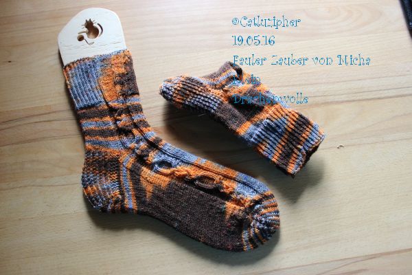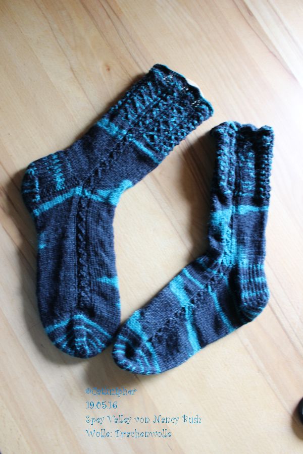Eine gut abgelagerte Drachenwolle verstrickte ich zu einem Paar aus Knitting on the Road, das ich abends im Bett nachstricke.