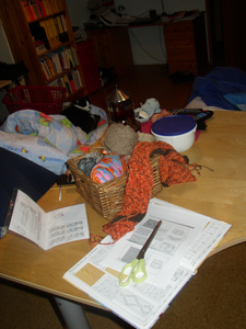 Klar, da drin sieht es richtig gesittet aus, die Strickereien liegen nämlich daneben. Zur Zeit steht noch alles neben meinem Stricksessel, wird aber nächste Woche wieder an seinen üblichen Paltz ziehen, wenn dieser dann noch existiert – wir wollen nämlich ein bisschen umräumen. Also hier sind die Bider: