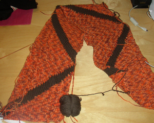 Wenn man genauer hinsieht erkennt man den Schal für meinen Herrn Gemahl, der natürlich zu hell, zu bunt und überhaupt farbig ist. Da ist mir gestern die Wolle ausgegangen – eigentlich sollte der fertig sein. Heute wird dann ein neuer Knäuel gekauft.