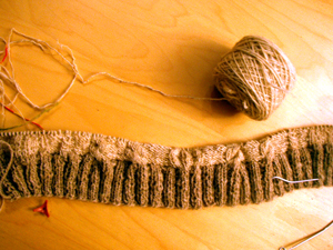 Zum Schluss mein aktuelles Großprojekt – ein Aran aus selbstgesponnener Coburger – Fuchs – Wolle.