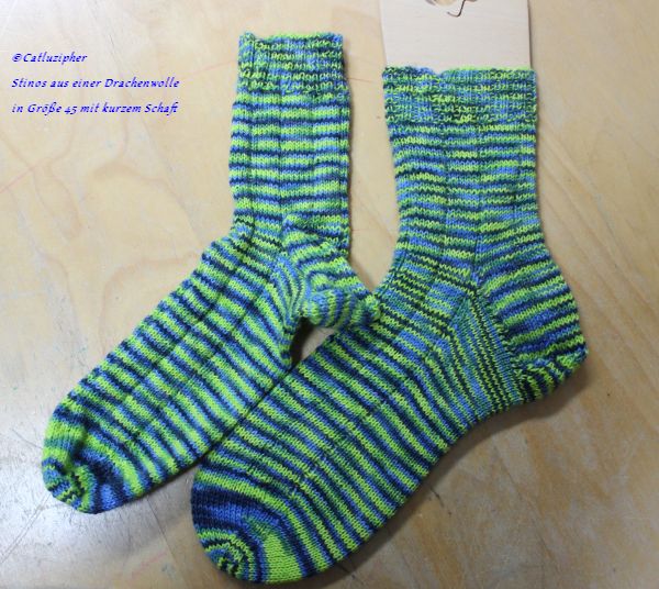 merke ich, dass es schon wieder Zeit ist für ein Geburtstagssockenpaar für den Adoptivbruder des Kamikazekindes – ich gehe auf die Suche nach einer schönen Wolle in blau / türkis / grün. Dieses Jahr ist es ein Drachenwollstrang geworden. Ich mag ja kontrastreiche Wollen und für Stinos eignen die sich auch sehr gut. Leider hat die Wolle geringelt und war nicht zum Wildern zu überreden. Die Socken sind auch so schön geworden, aber noch schöner fände ich sie, wenn sie gewildert hätten.
