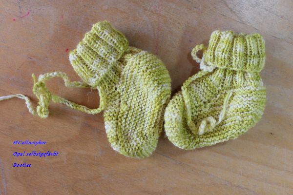 Ein Paar Booties ist fertig geworden – die Wolle stammt aus einer Notfallfärbung, die ich für eine Yodamütze für den Räuber färbte.