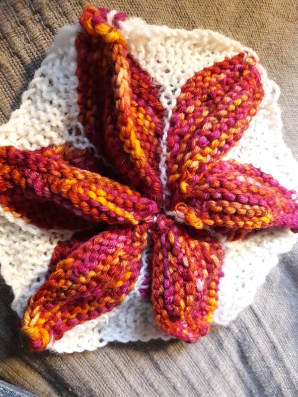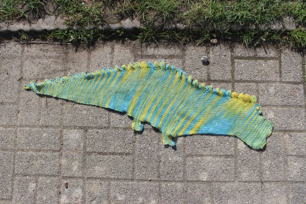 Ich habe so einige Stränge in Rosa/ Lila Tönen tauschen können und so zog ein Kaschmirsockenwollstrang der Drachenwolle von Wapiti bei mir ein, den das Kamikazekind sah, adoptierte und seine Verstrickung in einen Schal forderte. Ich begann weisungsgemäß einen Drachenschwanzschal. Das Kamikazekind beäugte das Strickwerk regelmäßig und irgendwann kam – der braucht Füße. Also strickte ich Füße an den Drachenschwanz. Aber Mama, der braucht doch auch einen Kopf – also strickte ich einen Kopf und selbstredend bekam der Kopf auch noch ein Auge. so entstand ein ganz besonderer Drachenschwanzschal fürs Kamikazekind.