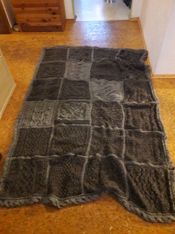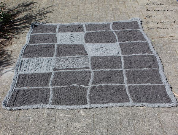 Ich bin tatsächlich fertig – fertig mit dem Great American Aran Afghan und ich bin sehr froh, dass ich es hinter mir habe. Den letzten nachgesponnenen Strang für die Umrandung trocknete ich dann kurz vor Ostern am Kamin 😉