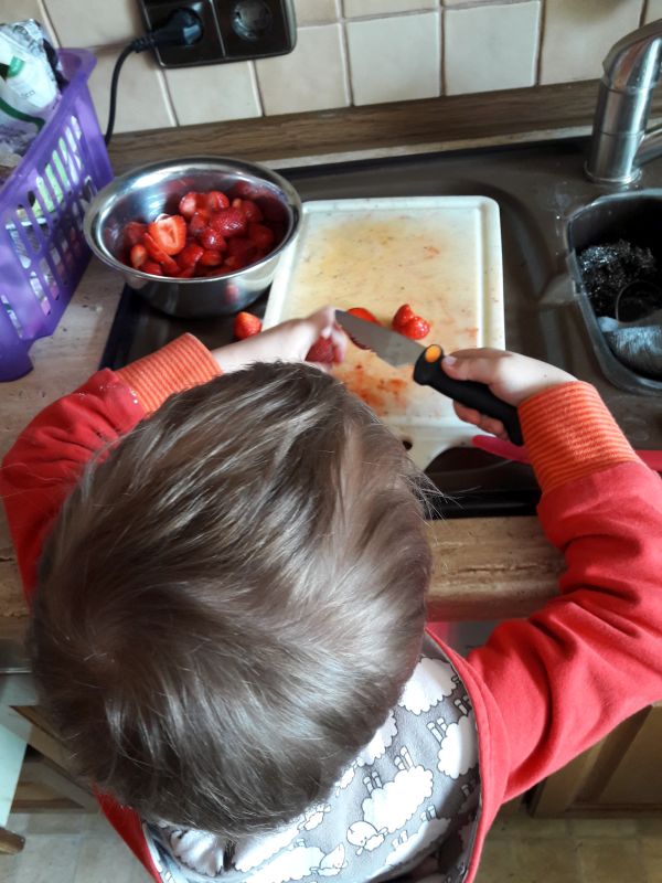 Wir backen viel und oft Erdbeerkuchen, denn es ist Erdbeerzeit.