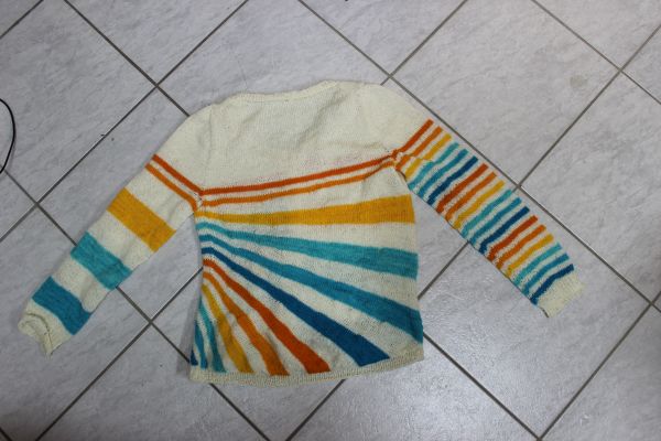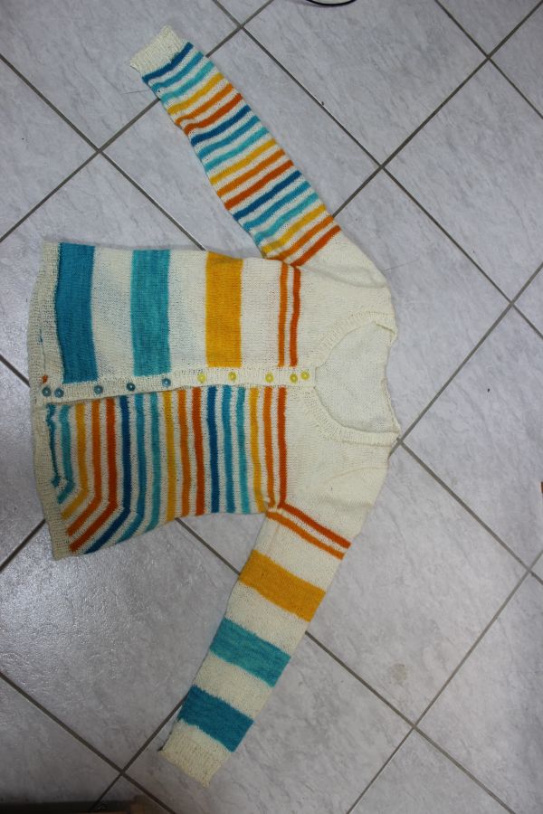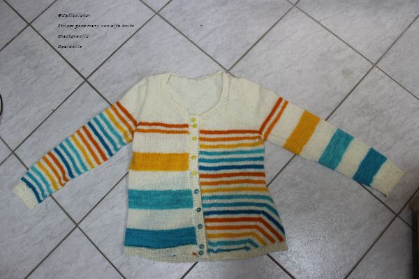 Die letzten Wochen standen im Strickzeichen des Stipes gone crazy, den ich am Ostersonntag begonnen habe. Das gute Stück war sehr kurzweilig zu stricken und das wunderbare Farbverlaufspaket, das ich vor einigen Jahren bei der Drachenwolle erstanden habe, tat sein übriges. Die Jacke flutsche einfach nur so über die Nadeln und nach nur knapp 6 Wochen war ich tatsächlich fertig und konnte die Jacke gestern schon zum Sockenstrickertreffen in Hechingen ausführen. Kombiniert mit dem Farbverlauf habe ich eine wollweiße Sockenwolle von Opal.