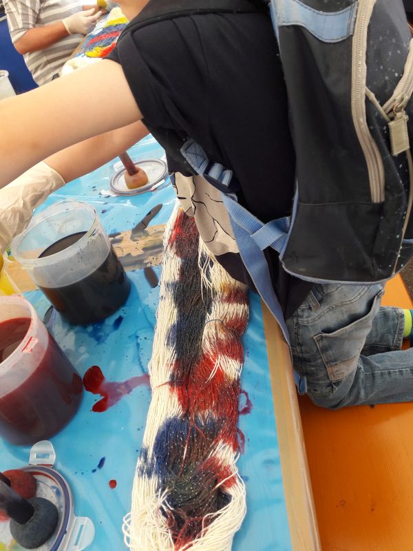 Ich war mit dem Räuber in Hechingen auf dem SOckenstrickertreffen um in Wolle zu schwelgen und noch viel wichtiger – einige tolle Menschen endlich wieder zu treffen und den Tag mit ihnen zu verbringen. Der Räuber durfte den obligatorischen Strang Wolle färben und tat dies mit viel Freude.