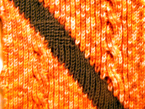 Der Schal hat mich mächtig geärgert – zuerst wolle ich einen Multidirektionsschal mit Schrägstreifen machen. Das hat sich aber mächtigst verzogen und musste geribbelt werden. Danach habe ich mich umentschieden und den Schal in Halbpatent mit verkürzten Reihen gearbeitet, denn Blockstreifen wollte ich auch nicht. Damit es beim Stricken nicht zu langweilig wurde, habe ich noch ein bisschen gezopft.