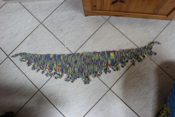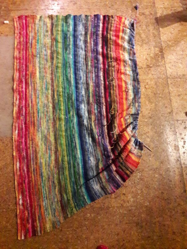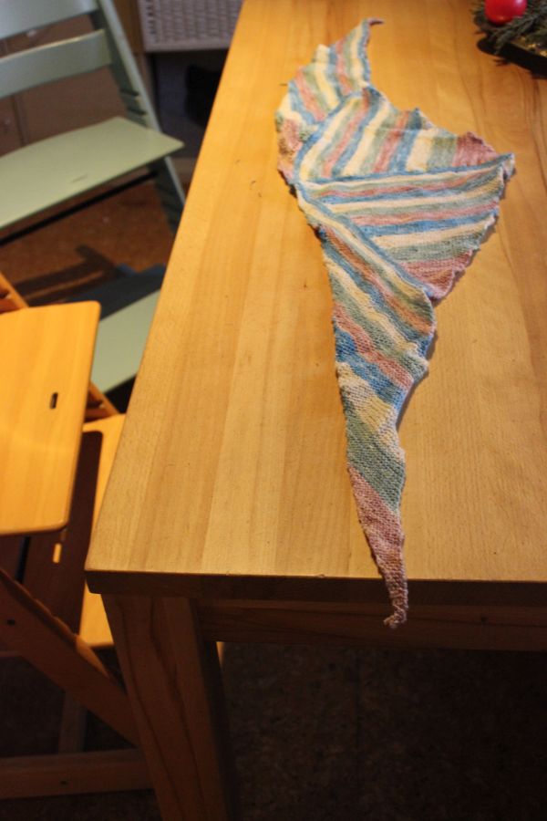 Dann habe ich in den Sommerferien einen Ecken+Kanten Tuch aus StrickistrackiRingelwolle begonnen und das entstandene Tüchle hat meine Schwester adoptiert.