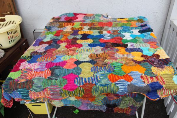 Die Applecorblanket von Franky Brwon ist hier nach über 6 Jahren fertig geworden. Sie besteht aus lauter einzelen handgefärbten Wolle und das Farbenspiel und die Farbenvielfalt lassen mein herz höher schlagen. Im Moment trocknet sie auf der Terrasse.