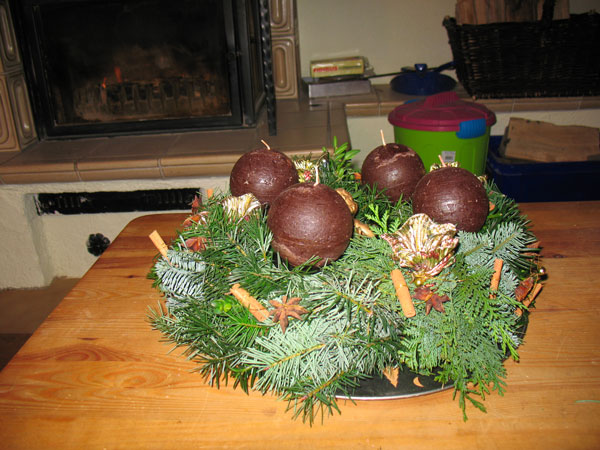 habe ich diesen Atzventzkrantz – mit Hilfe von Elisabeht, die mir gezeigt hat, wie so etwas richtig geht und dann auch nach etwas aussieht. Meine Interpretation sah anfangs etwas grobschlächtiger aus.