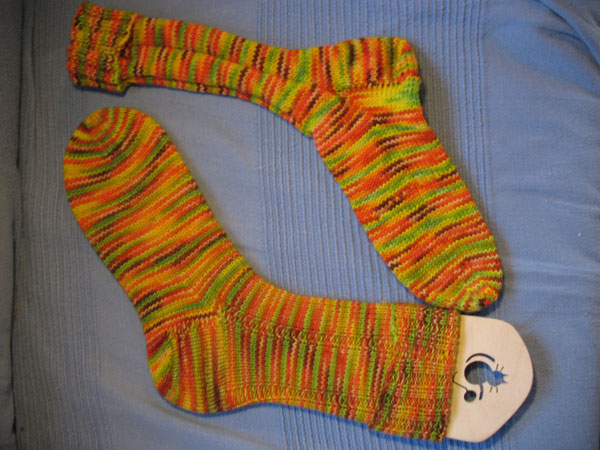 die Heimfahrtsocken vom Skiurlaub sind gestern fertig geworden. Die Wolle habe ich irgendwann im Sommer 2006 zusammen mit Wapiti gefärbt. Es ist eine 6 – fach Opalwolle, die ich im Fabrikverkauf in einem Restepaket mit weißer Färbewolle gefunden habe. Natürlich bleiben die Socken bei mir, weil ich gerade kalte Füße habe….. und weil die Farben so schön sind … weil ich so wenig Socken habe ;-)….. weil mir gerade danach ist…….. *grübelnachnochmehrgründen*