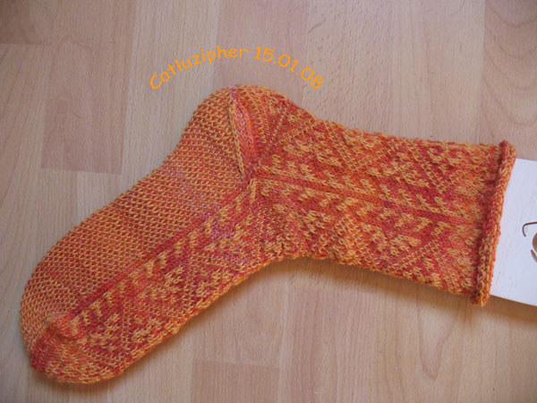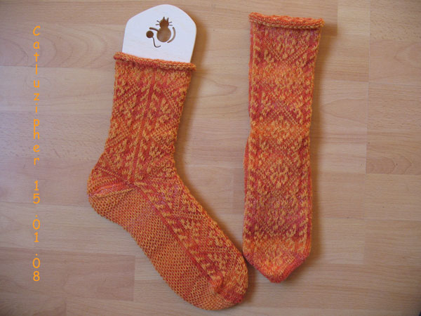 dauerte die Fertigstellung dieser Socken, dafür stricke ich aber auch für mein Leben gerne an solchen Socken, die mich faszinieren und auf die ichmich wirklcih konzentrieren muss. Auch ist an diesen Socken schön, dass ich sie meistens verschenke und dann auchmit meinen Gedanken oft bei demjenigen bin. Wenn dann noch die Farben so schön sind wie bei diesem Paar, dann ist es eine perfekte Beschäftigung über einige Wochen hinweg.