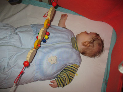eine nette kleine Familie macht sich fertig zum Babyschwimmen. Der kleine Lukas wird noch frisch gewickelt udn die Badetasche gepackt.