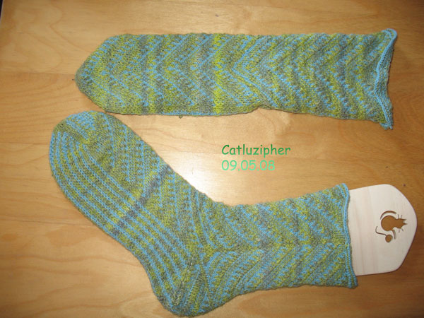 wenn mein Mann Urlaub hat komme ich zu nichts, gar nichts. Dennoch kann ich endlich ein Paar Socken zeigen, dass eigentlich schon ein paar Tage fertig ist, aber dieser Mann hält mich auf Trab – keine gemütlichen Strickstündchen mitten am Tag….., dafür Brennholzmachen und Zimmerherrichten für Lukas und missglückter Besuch der Landesgartenschau – die wollen doch tatsächlich 13 !!!!! Euro pro Person Eintritt und da wir nur 3 Stunden Zeit hatten, haben wir den Besuch bis auf weiteres verschoben und sind Eisessen gegangen – und Agility und Agility und Pekip und Lukas Taufe. Die Socken waren dann auch etwas aufwendiger in der Herstellung und damit nicht genug hat die zu bestrickende Person Schuhgröße 48!!!! (gefühlte Schuhgröße 67.)