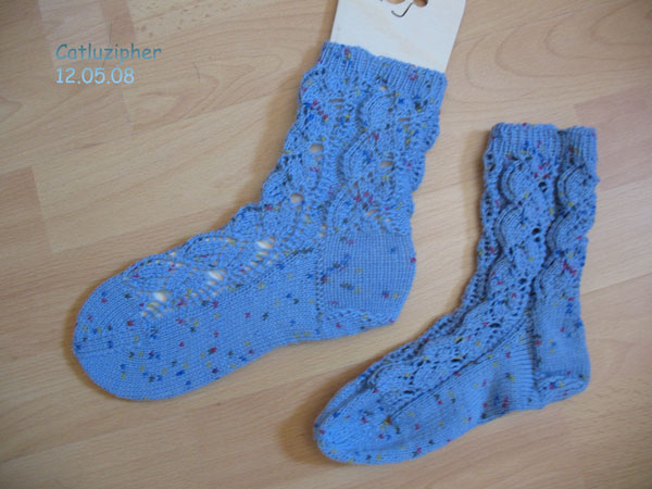 und somit kann ich gleich das nächste Sockenpaar zeigen. Im SKP2008 war das 2. Soceknmuster das Berliner Muster. Das hatte ich beim Zugsocking vor gut 2 Jahren schon einmal gestrickt. Damals habe ich die wunderschönste blaue Sockenwolle von Opal dafür genommen. Dieses Mal fiel die Wahl wieder auf ein Opalknäuelchen – und auf eines aus meiner Schatzkiste. Das Tüpfelesknäuel, das mit ChrisTine geschenkt hatte, verwandelte sich wie von alleine in diese Socken. Da sie mir etwas zu klein sind, werde ich sie meiner Schwiegermutter zum Geburtstag schenken. Farbe und Muster passen, denke ich, ganz gut.