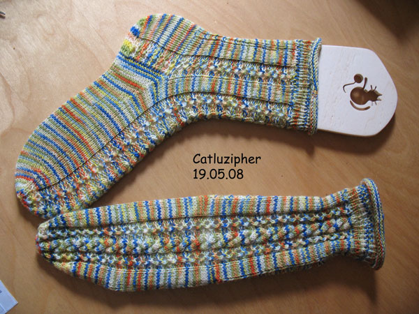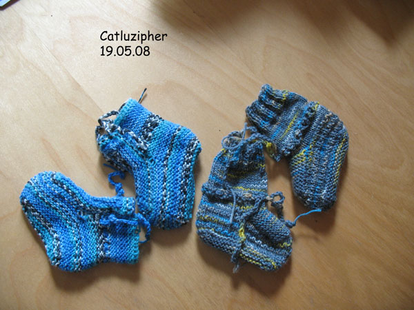 die Babyschühle sind richtig gut in meinem Strickkorb abgelagert und die rot – gelben Paulsocken haben doch fast 4 Wochena uf den Nadeln verbracht. Nur die Elementsocken sind in der letzten Woche entstanden. Den Strang dazu hat Wapiti für das Färbestrickwichteln gefärbt und ich habe ihn verstricken dürfen. Da der Strang wunderschön bunt war habe ich mich im Muster etwas zurückgehalten und nur Mustersteifen genadelt.