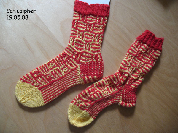 Und dann wurden die Socken für meinen Neffen Paul fertig. ER hat sie selbst bei mir bestellt *froi* und so habe ich mich auch gleich ans Werk gemacht und nach einiger Zeituach tatsächlich fertiggestellt. Er wünschte sich Socken in rot und gelb und er kriegt rot – gelbe BADEN – Socken.