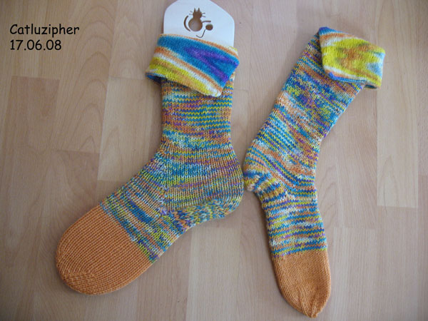 da ich immer ohne Schuhe spinne und das im Winter bisweilen etwas kalt ist an den Zehen und weil das nächste Paar in dem Buch New Pathways for Sockknitters ein doppeltdickes Paar war ist aus dem zweiten Strang des Sommerabos dieses Paar entstanden. Fasziniert war ich vom Farbverlauf im Umschlagbündchen. Der ist sooooooooo wunderschön.