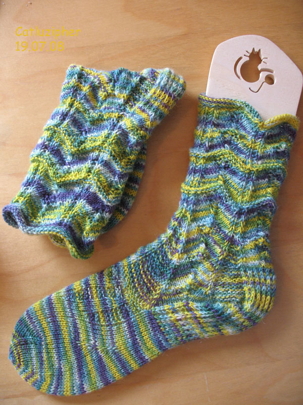 ein tolles Muster aus dem Buch New Pathways for Sockknitters, das zwar etwas Konzentration braucht, aber auch so logisch aufgebaut ist, dass man nicht komplett von der Außenwelt abgeschnitten ist. Etwas seltsam sieht die fertige Socke ja aus, wenn sie nicht auf dem Sockenbrettoder am Fuß ist, aber das zieht sich hin, wenn die Socke getragen wird.