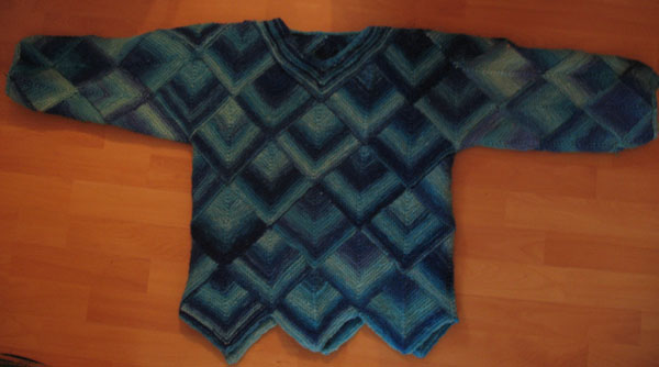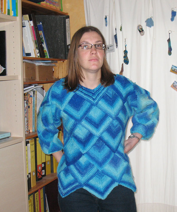 und so ganz nebenbei entstand bei mir in den letzten Wochen dieser Patchpulli. Die Wolle ist eine von mir handgesponnene Ombria. Das Design ist auch mal wieder Eigenbaun und nun mag ich  im Moment keine Patche mehr sehen *grins