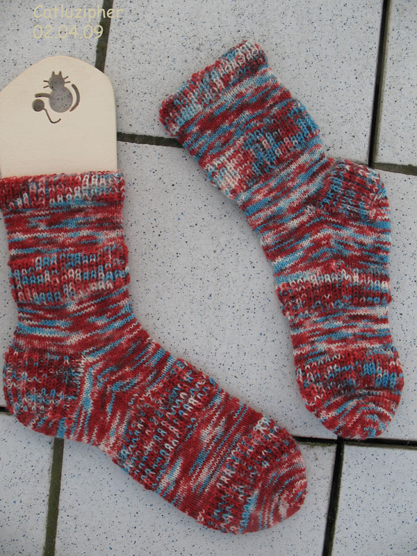 hat mich sofort fasziniert und die Faszination hat mich beim Stricken dann verlassen 🙁 – Die Farben gefallen mir immernoch, den Strang würde ich auch sofort wieder kaufen, aber das Ergebnis mit meiner Maschenzahl ist nicht so mein Fall. Aber mein Papa hat sie sofort adoptiert und so habe ich noch 10 Reihen angestrickt.