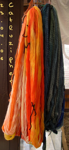 von einem Dauerlauf quer durch den Garten ( zum Glück hatten die Nachbarn andere Dinge zu tun als mich bei meinem Tun zu bewundern), von einem bisschen Farbe, einer Stunde Backofen und einem Bad in der Waschmaschine. Zum Glück hat die Waschmaschine die Wollstränge nicht verwurstelt. Die habe ich nämlich vorher in Srümpfe gesteckt und diese fest zugeknotet.