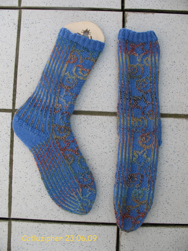 brachte mir Beates neueste Musterkreation in die letzten doch wieder recht anstrengenden Schulwochen.Es ist doch jedes Jahr das gleiche. Ich mag ja Einstrickmuster sehr und so nahm ich das Angebot, diese Socken testzustricken gerne an und ich war wieder hin und weg.
