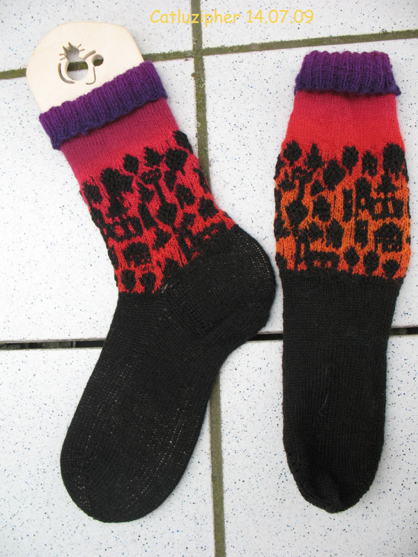 und Stoff zur Interpretation gibt es bei diesen Socken reichlich. Sie haben uns schon die Fahrt nach Nordenham zu Hellas Treffen inspiriert – oder eher meine beiden Mitfahrerinnen. Katzen und Elefanten und Giraffen wollen gesehen worden sein. Häuser, Bäume und Kirchen habe ich stricken wollen. Nun ja, geblieben ist von meinen Socken die Hauptidee – der Farbverlauf der aufgehenden Sonne im Hintergrund.